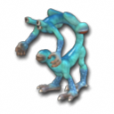 Extraña y amorfa criatura de colores azules brillantes que tiene 3 bocas,,, 3 ojos y 3 patas con poderosas garras y tiene forma de C al revés.